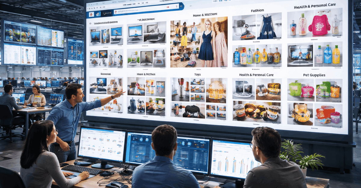 Amazon groups products by major consumer needs. These include Electronics, Home & Kitchen, Health & Personal Care, Fashion, Toys, Grocery, and Pet Supplies.